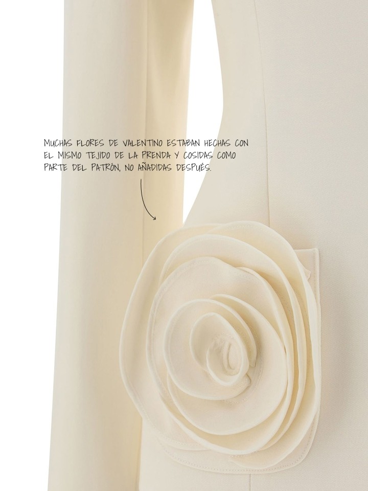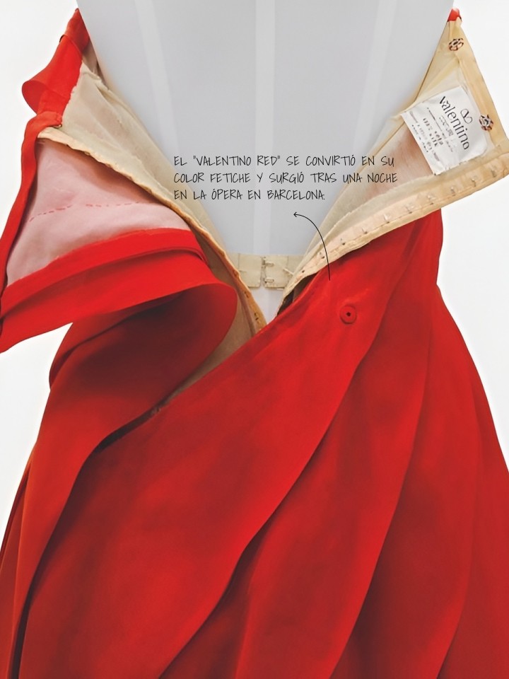 El uso del color, especialmente el famoso "Rosso Valentino”, el volumen en vestidos de alta costura, la presencia recurrente de flores y, más adelante, el VLogo, se transformaron en elementos que aparecían de forma reiterada en sus colecciones.